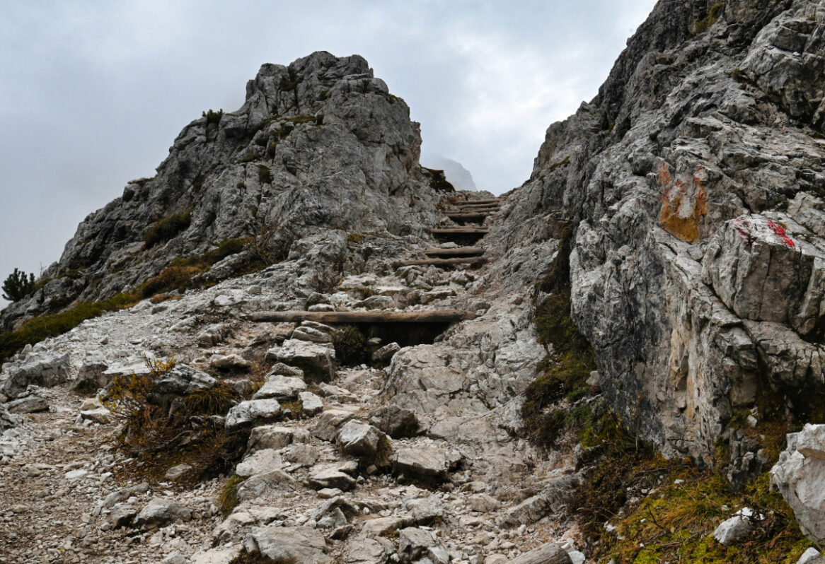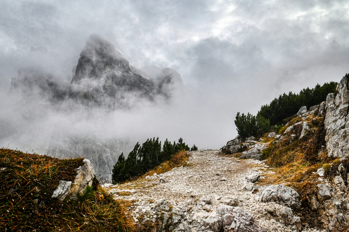Nad hlavou sa mi začína trhať oblačnosť. Nie že by bolo vyslovene krásne a jasno, ale konečne od rána vidieť aj modrú oblohu. Situácia za hrebeňom Fiscalín je však stále rovnaká – mlieko. Nie je vidieť ani sedlo Forcella Pian di Cengia. Turistický chodník č. 101 (World Heritage Trail 6) idúci od Rifugio Locatelli do sedla sa predo mnou začína vynárať niekde vo výške 2250 m a ja si hovorím ako dobre, že som si zobrala mačiatka. Je pokrytý zvyškami snehu, ktorý sa cez deň nemá veľmi šancu roztopiť – slnko tam takmer nesvieti. Z oblakov sa postupne vynára Torre di Toblin (2564 m) aj Monte Paterno (2744 m) a ja si uvedomujem, že už som skoro pri chate. Medzičasom som vyšla zo závetria doliny a musela som si obliecť vestu aj nákrčník, ale zima sa dá smerom do kopca stále dobre zvládať. Telo vydáva prebytok vlastnej energie. Idem už doslovne z nohy na nohu a teším sa na to, ako si po skoro štyroch hodinách sadnem niekde na lavičku, najem sa a zhodnotím svoje možnosti.