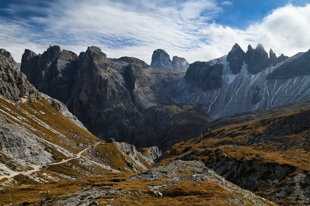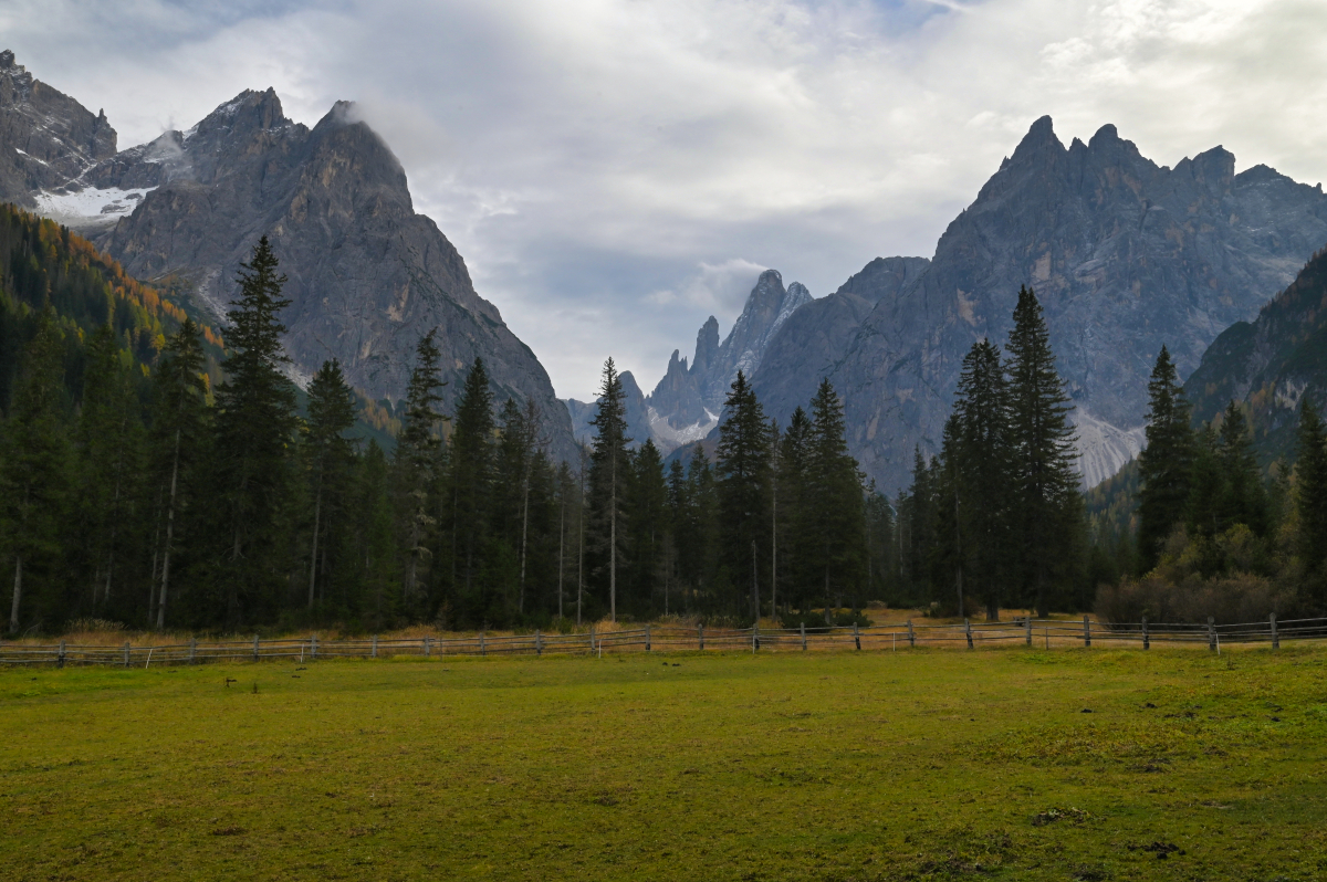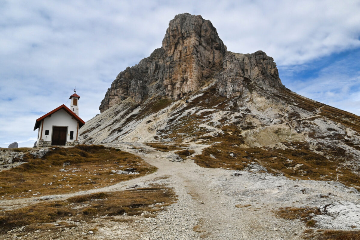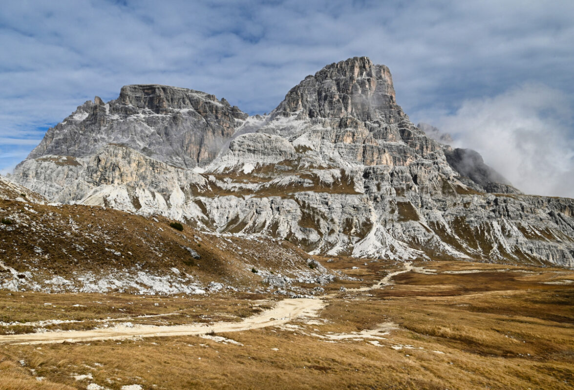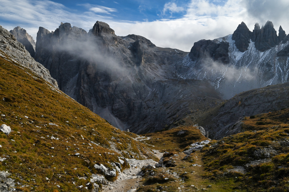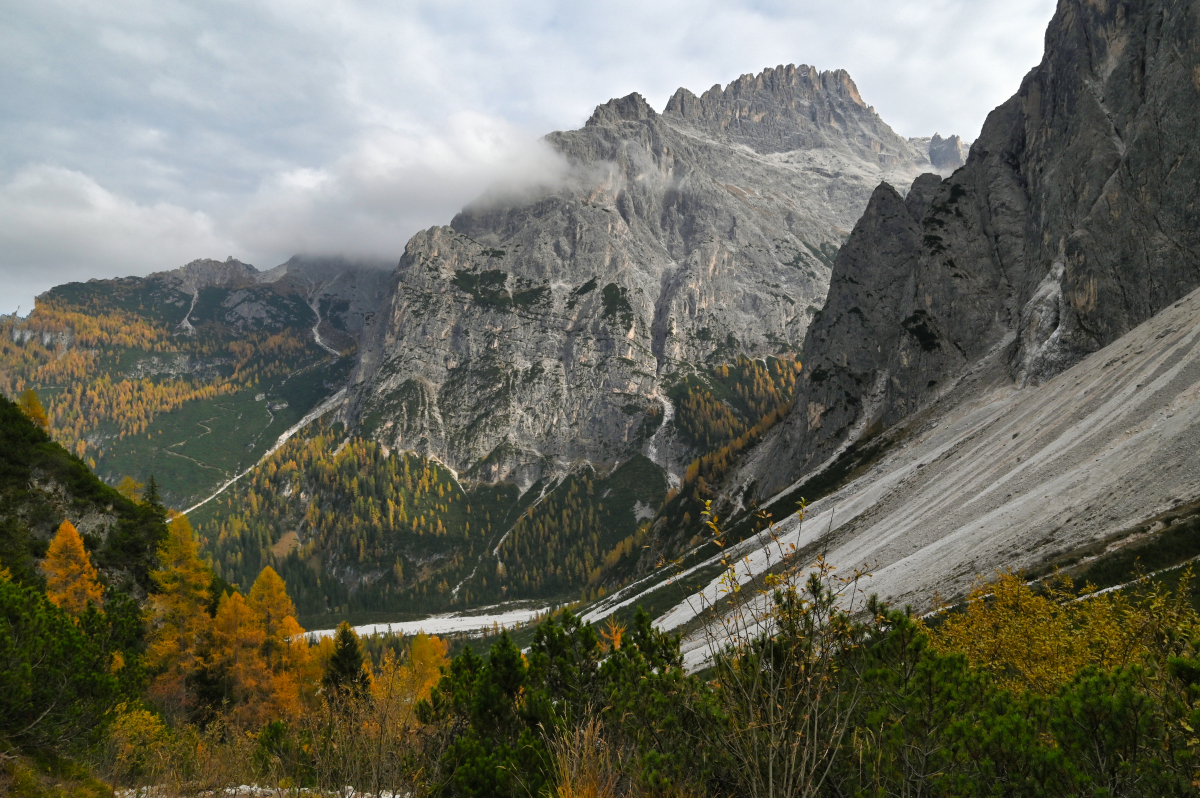 Chodník vedie popri potoku, v ktorom nie je po vode ani pamiatky. Minimálne nie prvú hodinu, hodinu a pol. Keď konečne vychádzam z lesa a dostávam sa do pásma kosodreviny, môžem naplno obdivovať divadlo, ktoré mi predvádza vietor s oblakmi. Tie sa neustále prevaľujú po štítoch nado mnou, ale Croda Fiscalina Est (2677 m), Croda Fiscalina di Mezzo (2675 m) aj Croda Fiscalina Ovest (2635 m) všetko držia na južnej strane – pri chatách Rifugio Pian di Cengia a Rifugio Zsigmondy – Comici. V prudšom kopci každú chvíľu stojím a fotím. A oddychujem. Je to tretí deň, som dva týždne po viróze a telo už to začína cítiť. Vnútorne som zmierená s možnosťou, že sa od Tre Cime tadiaľto budem vracať a tým pádom viem, že času mám habadej a niet sa kam ponáhľať. Keď sa ku Rifugio Locatelli dostanem do dvanástej, som v časovom pláne, v ktorom by som ešte teoreticky mohla spraviť celý okruh – nie iba cestu hore a zase dole.